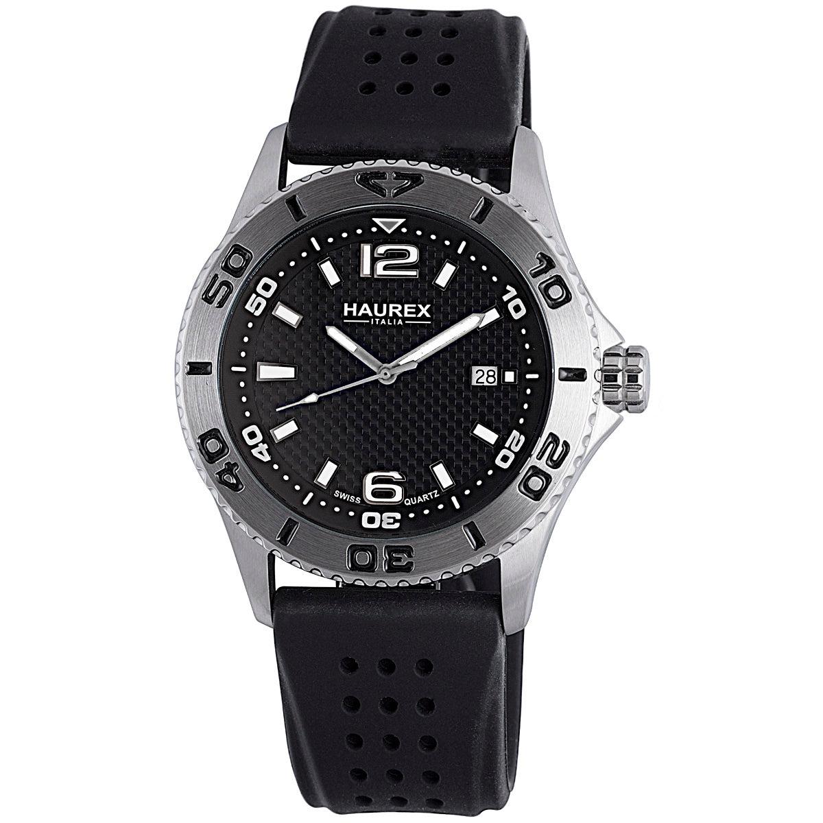 Practical and precise, this Haurex mens Factor watch is a casual timepiece with many convenient features. Encased in stainless steel, its black carbon pattern dial has luminous hands and hour markers, as well as a second hand and date window. A unidirectional rotating bezel with a minute track surrounds the dial. Its black rubber straps comfortably close with a buckle clasp for safe and secure all day wear. Powered by reliable Quartz movement and water resistant to 50 meters, it is a funky addition to any timepiece collection.