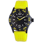 Practical and precise, this Haurex mens Factor watch is a casual timepiece with many convenient features. Encased in black IP coated stainless steel, its black carbon pattern dial has luminous hands and hour markers, as well as a second hand and date window. A unidirectional rotating bezel with a minute track surrounds the dial. Its yellow rubber straps comfortably close with a buckle clasp for safe and secure all day wear. Powered by reliable Quartz movement and water resistant to 50 meters, it is a funky addition to any timepiece collection.